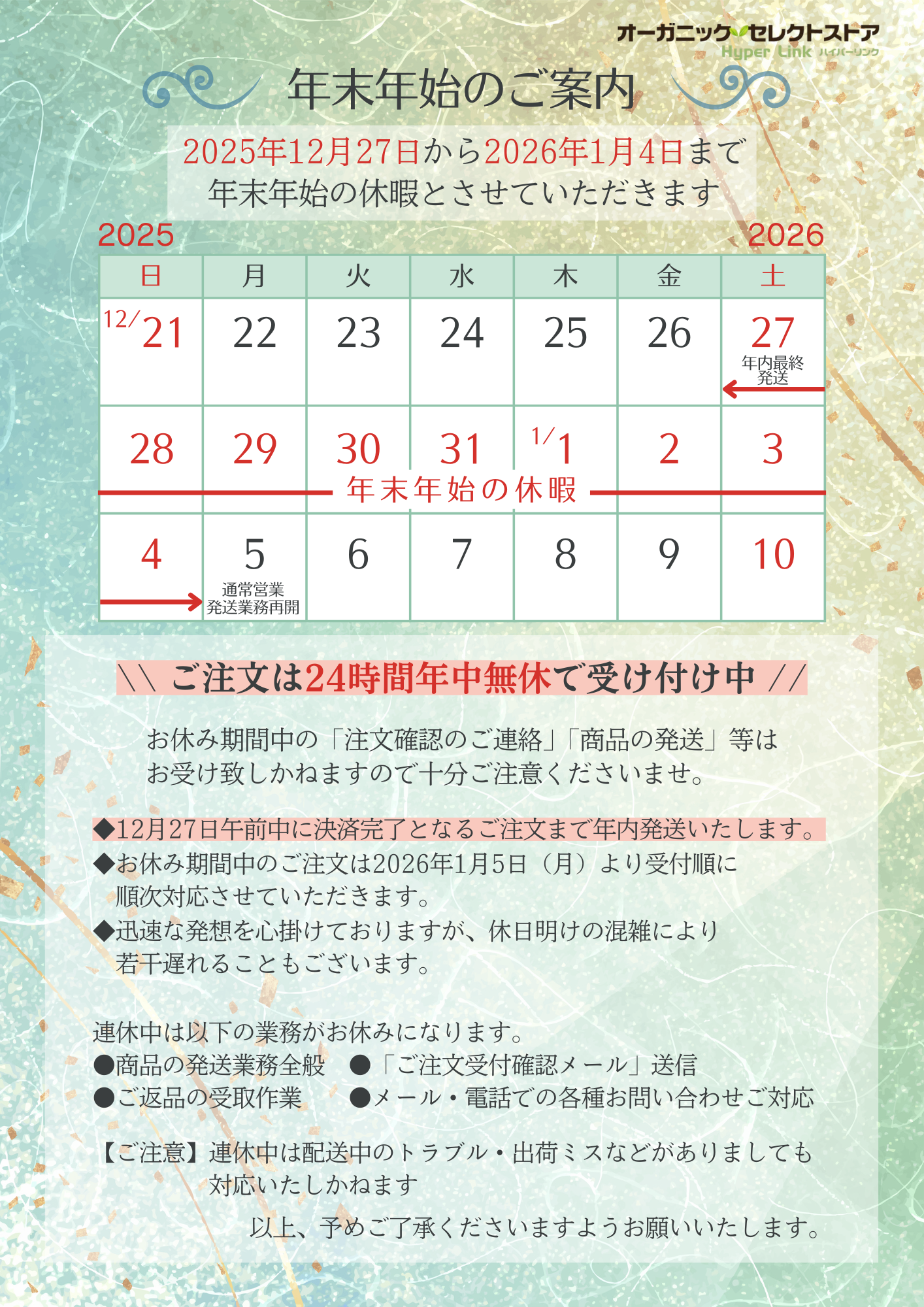 ご注文時に受注確認のメール『【オーガニックセレクトストア】 ご注文ありがとうございます。』が送信されますが、ご注文内容の確認及び出荷作業は営業開始日より再開させていただきます。
